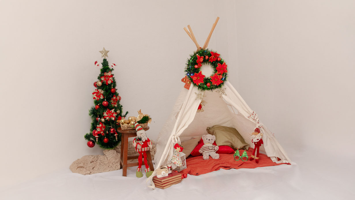 🌟 Cenário Aconchegante: A barraca teepee, decorada, cria um ambiente mágico, influenciado pelo estilo boho. Uma experiência única para capturar a essência acolhedora das festas.